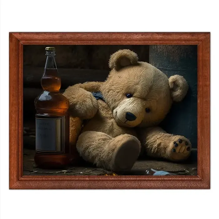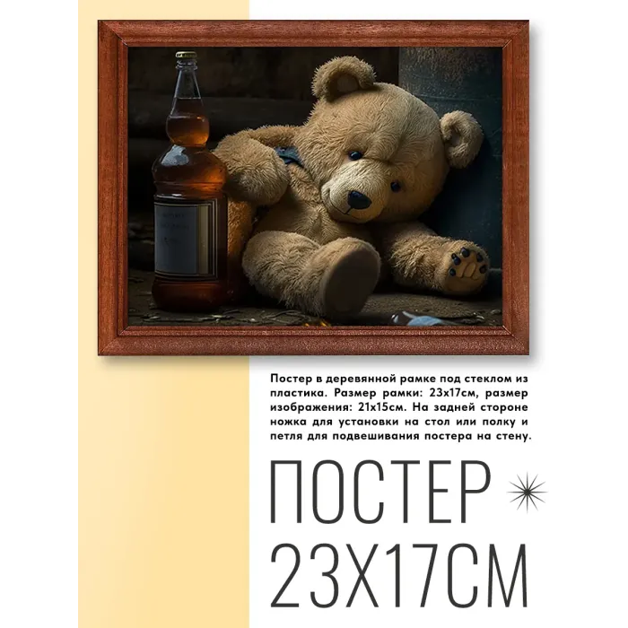 Постер в деревянной рамке с изображением плюшевого медведя для настенного или настольного размещения.