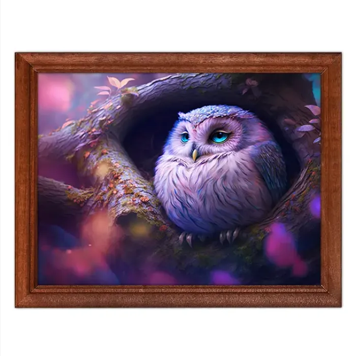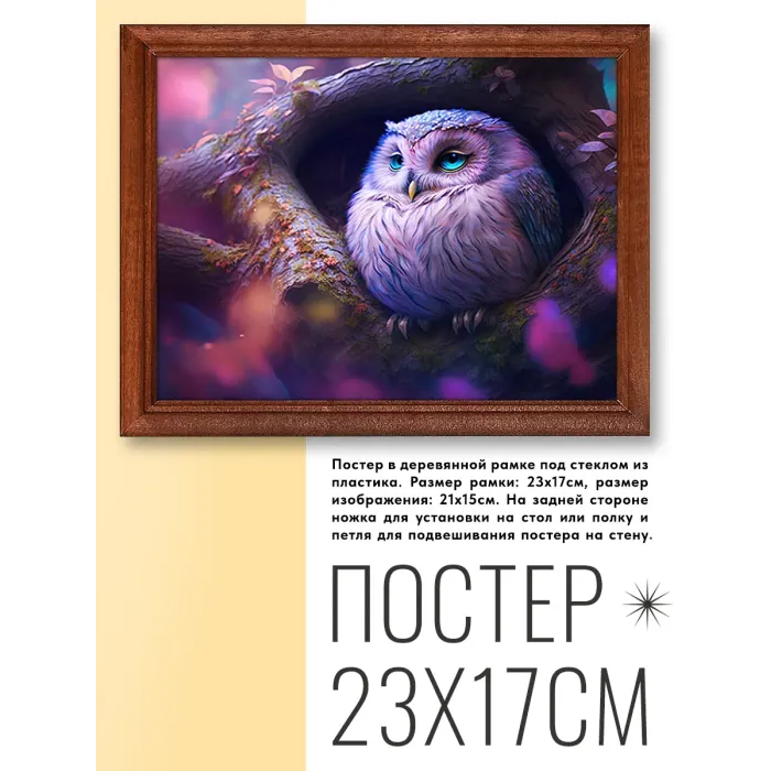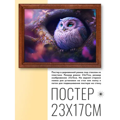 Постер в рамке с изображением совы для интерьерного декора. Деревянная рама под пластиковым стеклом.