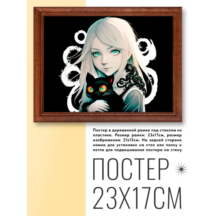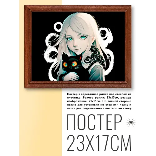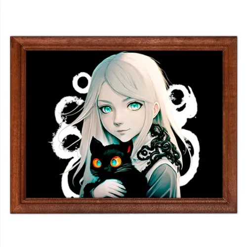 Постер в деревянной рамке с изображением аниме-девушки и кошки.