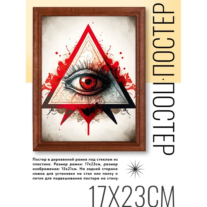 Постер 'Всевидящее око' в стильной деревянной рамке станет оригинальным элементом декора для различных пространств. Этот предмет искусства поможет создать уникальную атмосферу в салонах, магазинах, офисах и кафе. Основные особенности: