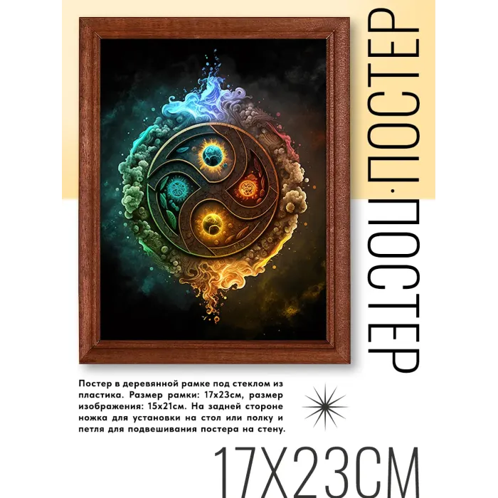 Постер в рамке «4 стихии» для интерьерного декора. Рамка из дерева с пластиковым стеклом.