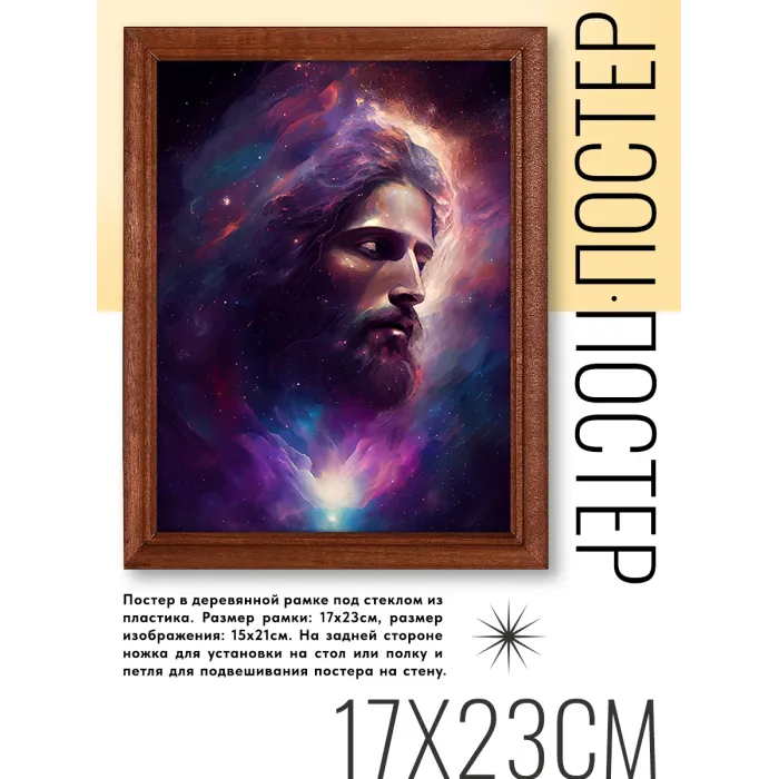 Постер в рамке с изображением Иисуса. Изготовлен в деревянной рамке под пластиковым стеклом.