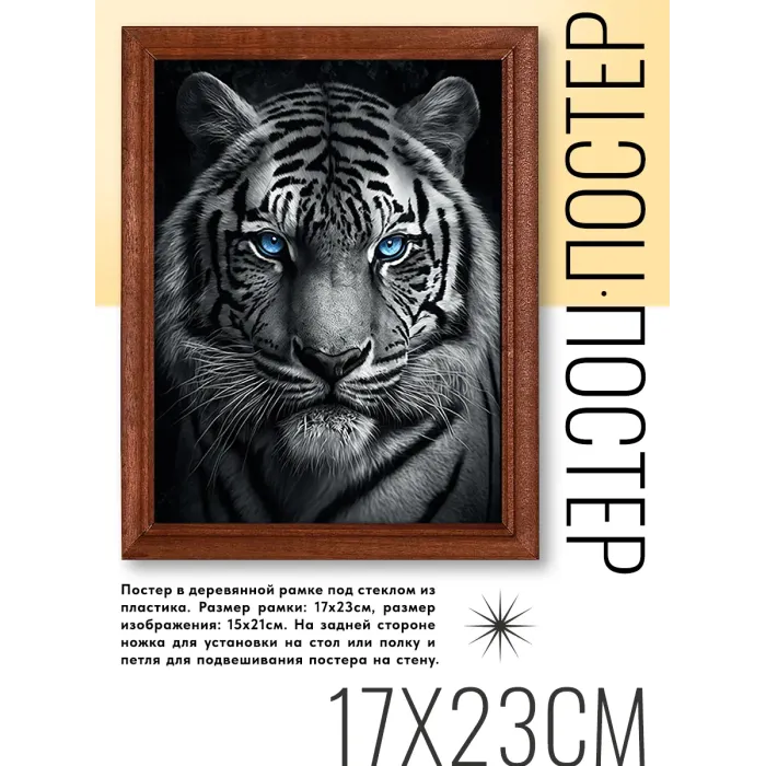 Постер в рамке для интерьерного декора. Деревянная рамка с пластиковым стеклом и изображением тигра.