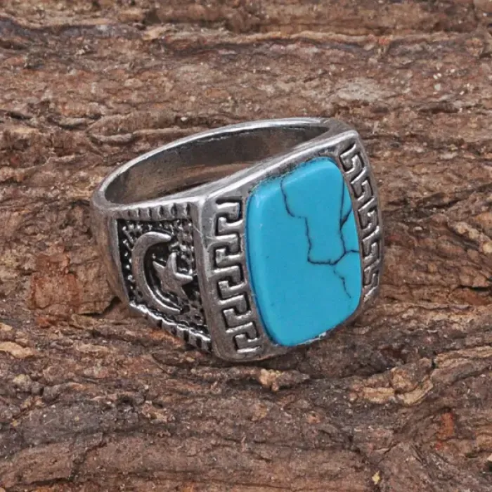 Кольцо с вставкой из синтетической бирюзы, изготовленное из бижутерного сплава.