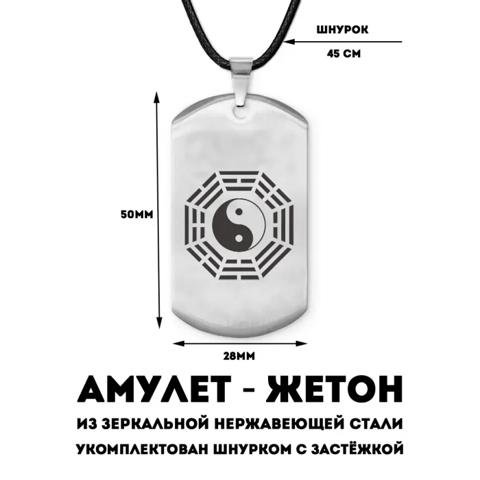 Амулет-жетон Ба-Гуа (Инь-Ян) — сувенирный аксессуар из полированной нержавеющей стали с лазерной гравировкой.