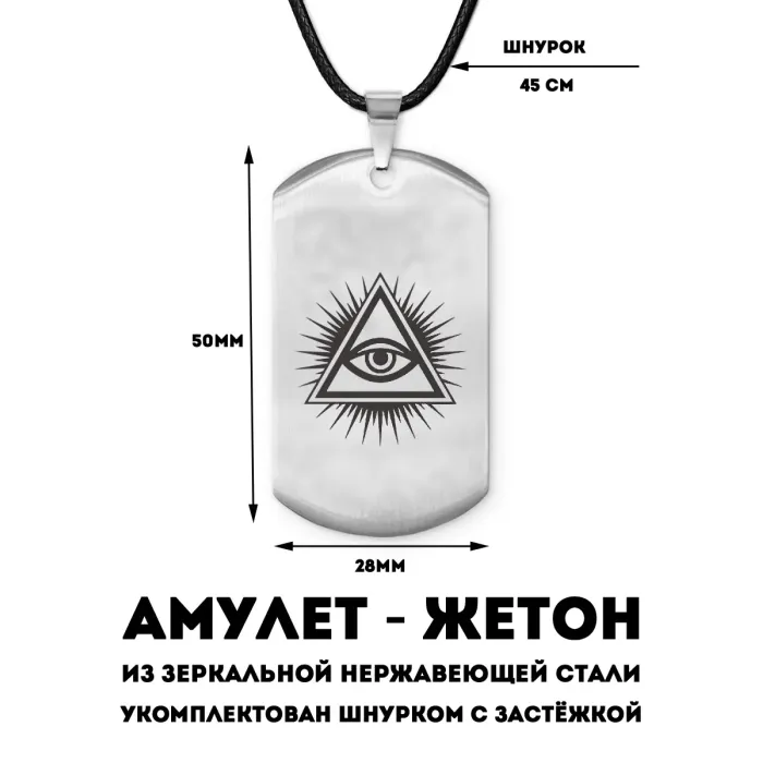 Амулет-жетон Всевидящее око — сувенирный аксессуар из полированной нержавеющей стали с лазерной гравировкой.