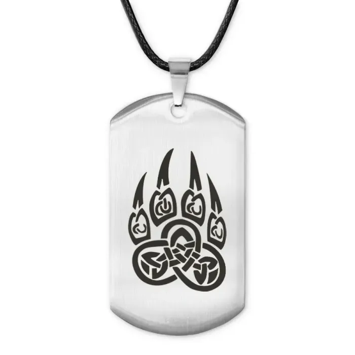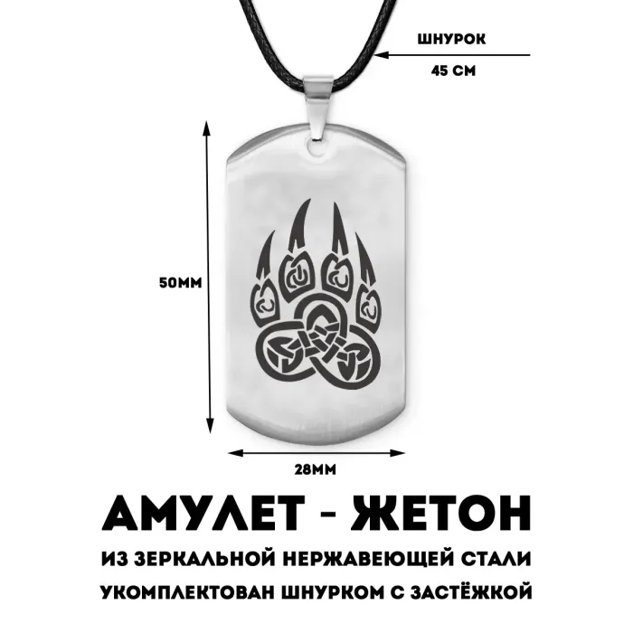 Амулет-жетон из нержавеющей стали с лазерной гравировкой в виде волчьей лапы.