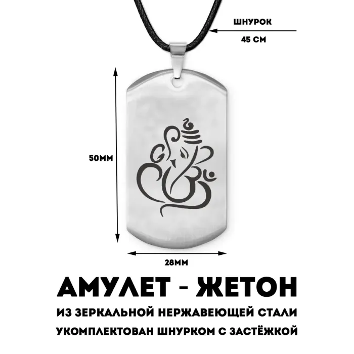 Амулет-жетон с изображением Ганеши, выполненный из полированной нержавеющей стали с зеркальной поверхностью.