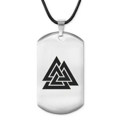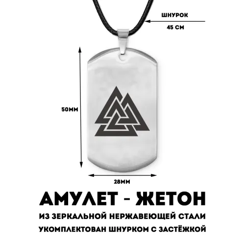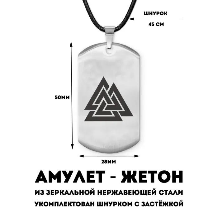 Амулет-жетон Валькнут из полированной нержавеющей стали с лазерной гравировкой символа на одной стороне.