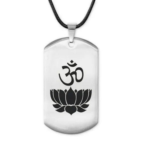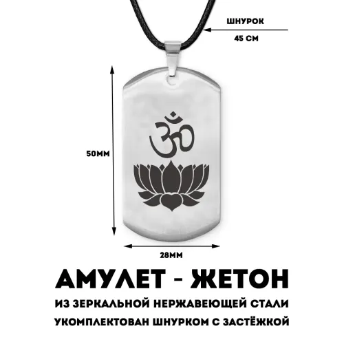 Амулет-жетон из полированной нержавеющей стали с лазерной гравировкой символа Ом и лотоса.
