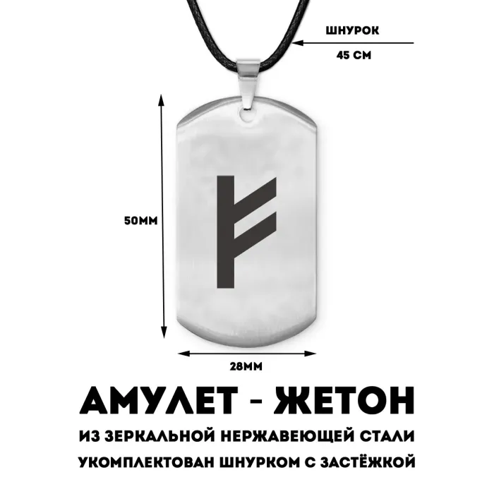 Амулет-жетон Феху — сувенирный аксессуар из полированной нержавеющей стали с лазерной гравировкой на одной стороне.