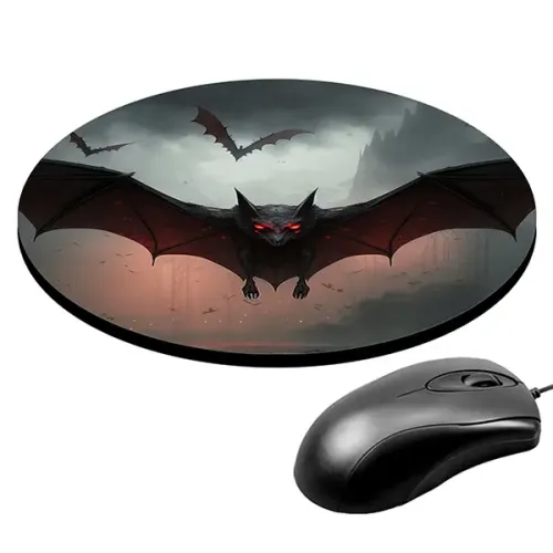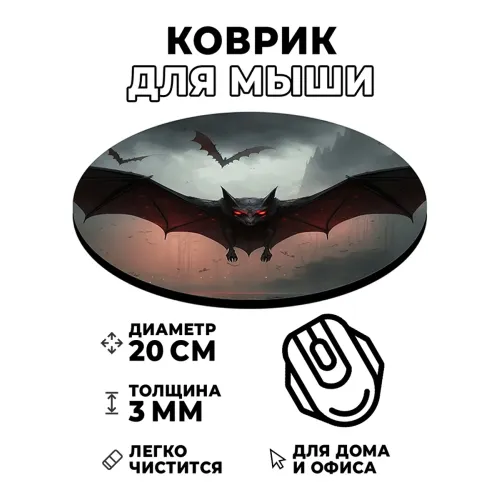 Коврик для компьютерной мыши с оригинальным изображением летучей мыши привнесёт уникальность в рабочее пространство. Он станет не только практичным аксессуаром, но и стильным элементом декора. Диаметр коврика составляет 20 см, а толщина – 3 мм, что обеспечивает комфортное использование.