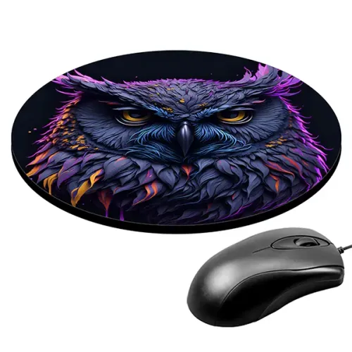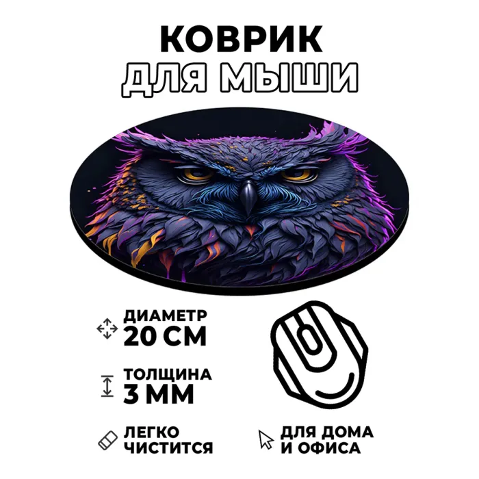 Коврик для мыши с изображением совы — это не только практичный аксессуар, но и стильный элемент рабочего пространства. Обладая диаметром 20 см и толщиной 3 мм, он идеально подходит для комфортной работы за компьютером.