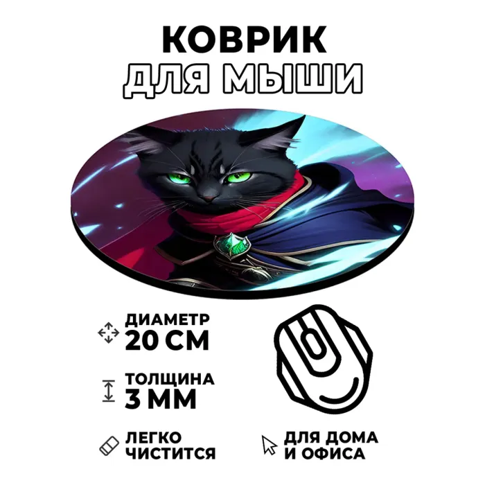 Коврик для мыши с изображением кота-волшебника станет не только практичным аксессуаром, но и стильным элементом рабочего пространства. Этот коврик диаметром 20 см и толщиной 3 мм обеспечивает отличное скольжение компьютерной мыши благодаря качественным материалам. Изображение на поверхности стойкое, четкое и контрастное, что добавляет яркости в повседневные задачи. Такой коврик может стать отличным подарком или дополнением к любому интерьеру.