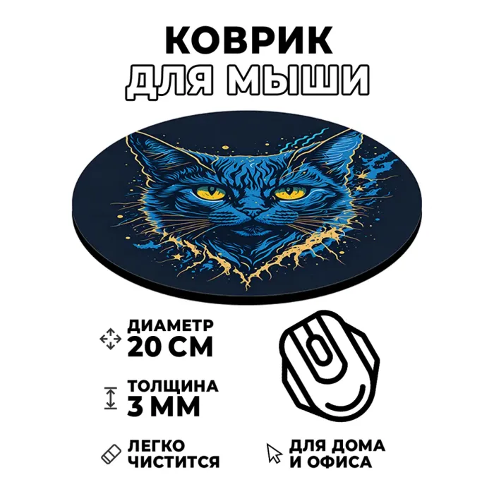 Коврик для компьютерной мыши с изображением кота станет стильным дополнением рабочего места и подарит уют в каждом клике. Этот коврик диаметром 20 см и толщиной 3 мм обеспечивает отличное скольжение мышки, что делает его идеальным выбором для работы и игр.