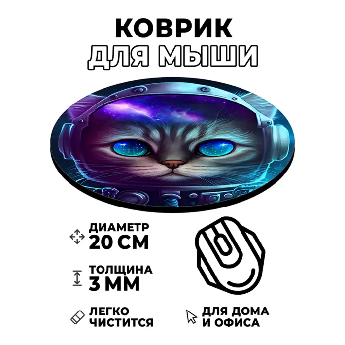 Коврик для компьютерной мыши с изображением кота в скафандре — это не только практичный аксессуар, но и стильный элемент рабочего пространства. Он станет отличным подарком для любителей космоса и животных.