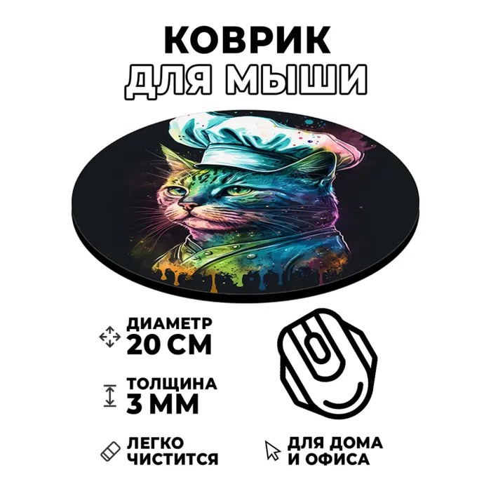 Коврик для компьютерной мыши с изображением кошки станет стильным дополнением рабочего места и подарит уют в каждом клике. Этот коврик диаметром 20 см и толщиной 3 мм обеспечивает отличное скольжение мышки благодаря качественным материалам. Изображение на коврике отличается стойкостью, четкостью и контрастностью, что добавляет яркости в повседневную работу за компьютером. Идеальный выбор для любителей животных и тех, кто ценит комфорт при работе с техникой.