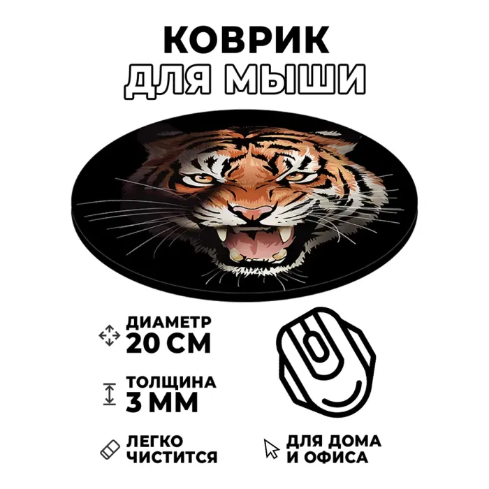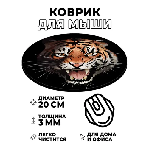 Коврик для компьютерной мышки с изображением тигра станет ярким акцентом рабочего места и символом силы и уверенности. Его диаметр составляет 20 см, а толщина – 3 мм, что обеспечивает комфортное использование. Изображение отличается стойкостью, четкостью и контрастностью, что делает его привлекательным дополнением к любому интерьеру. Коврик обеспечивает отличное скольжение мышки, позволяя работать или играть без лишних усилий. Этот аксессуар не только функционален, но и привносит в обстановку нотку дикой природы.