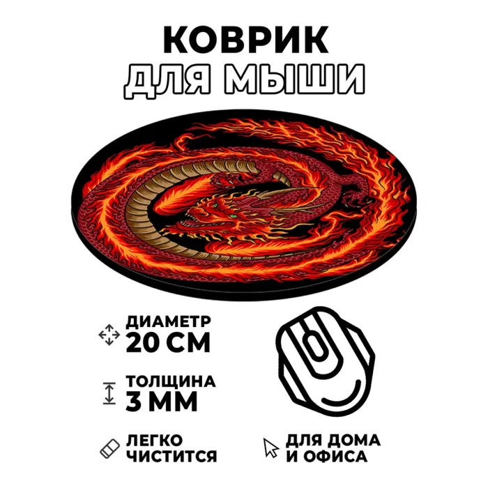 Коврик для компьютерной мышки с изображением дракона — это не только практичный аксессуар, но и стильный элемент рабочего пространства. Его диаметр составляет 20 см, а толщина — 3 мм, что обеспечивает комфортное использование. Изображение на коврике отличается стойкостью и четкостью, позволяя наслаждаться яркими цветами каждый день. Коврик гарантирует хорошее скольжение мышки, что делает работу за компьютером более приятной и продуктивной.