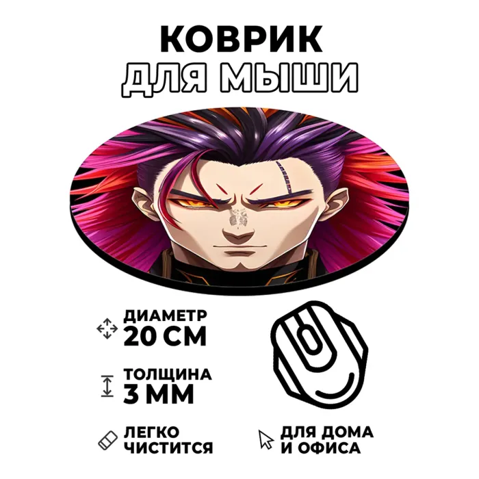 Коврик для компьютерной мыши с ярким изображением в стиле аниме. Символизирует увлечение японской культурой и отлично подходит как для работы, так и для игр. Диаметр коврика составляет 20 см, а толщина — 3 мм, что обеспечивает комфортное использование. Изображение отличается стойкостью и четкостью, а также контрастностью, что делает его привлекательным элементом рабочего пространства. Коврик обеспечивает хорошее скольжение мышки, позволяя легко управлять курсором.