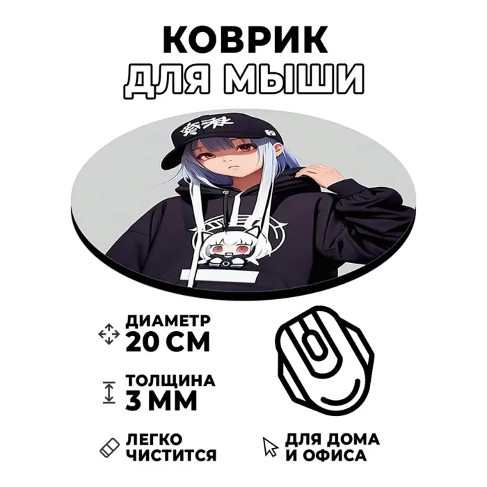 Коврик для компьютерной мышки с изображением аниме-девушки в худи станет стильным дополнением рабочего места. Он не только украшает пространство, но и обеспечивает комфорт во время работы или игр. Диаметр коврика составляет 20 см, а толщина — 3 мм, что гарантирует отличное скольжение мышки и долговечность использования.