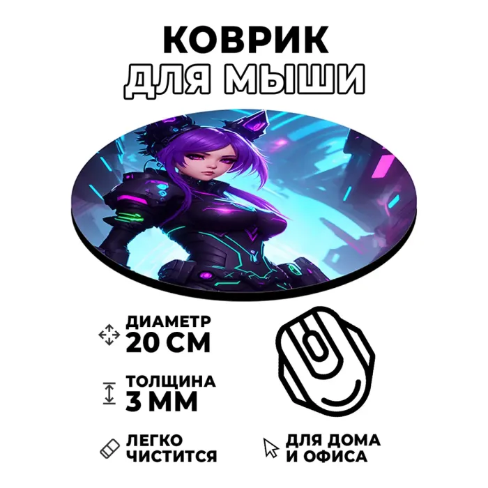 Коврик для компьютерной мыши с уникальным изображением в стиле киберпанк, который добавит яркости и индивидуальности любому рабочему месту. Этот коврик диаметром 20 см и толщиной 3 мм обеспечивает отличное скольжение мышки благодаря качественным материалам. Изображение отличается стойкостью, четкостью и контрастностью, что делает его не только функциональным аксессуаром, но и стильным элементом декора. Идеально подходит как для работы, так и для игр.