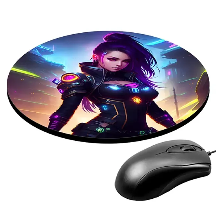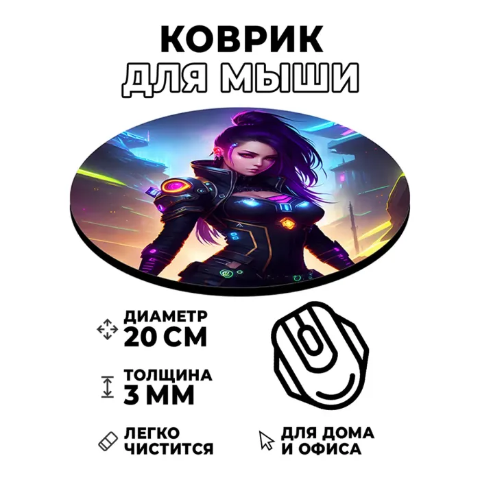 Коврик для компьютерной мыши с уникальным изображением в стиле киберпанк, который станет ярким акцентом на рабочем месте. Этот коврик диаметром 20 см и толщиной 3 мм обеспечивает отличное скольжение мышки, что делает его идеальным выбором как для работы, так и для игр.