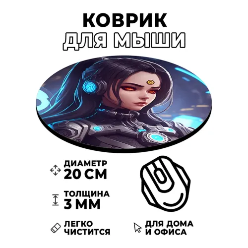 Коврик для компьютерной мыши с ярким изображением в стиле киберпанк, который добавляет уникальности и стиля в рабочее пространство. Этот коврик имеет диаметр 20 см и толщину 3 мм, обеспечивая комфортное использование. Изображение отличается стойкостью, четкостью и контрастностью, что делает его привлекательным элементом декора. Специальная поверхность обеспечивает отличное скольжение мышки, что способствует повышению удобства при работе или игре на компьютере.