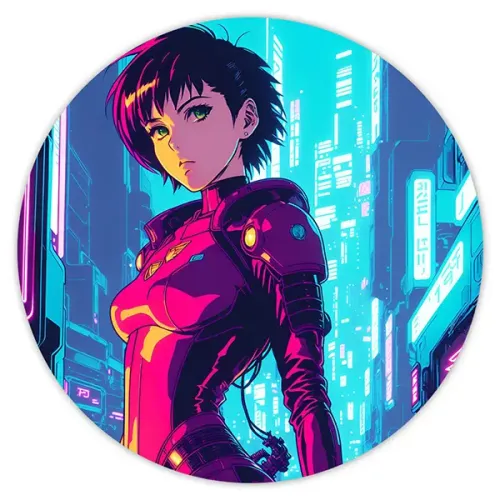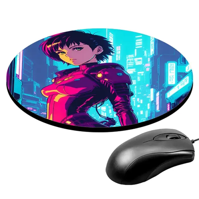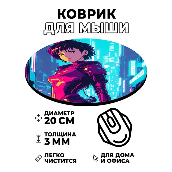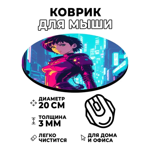Коврик для компьютерной мыши с уникальным изображением в стиле киберпанк. Этот аксессуар не только украсит рабочее место, но и создаст атмосферу футуристического мира аниме. Диаметр коврика составляет 20 см, толщина — 3 мм, что обеспечивает комфортное использование и хорошее скольжение мышки.