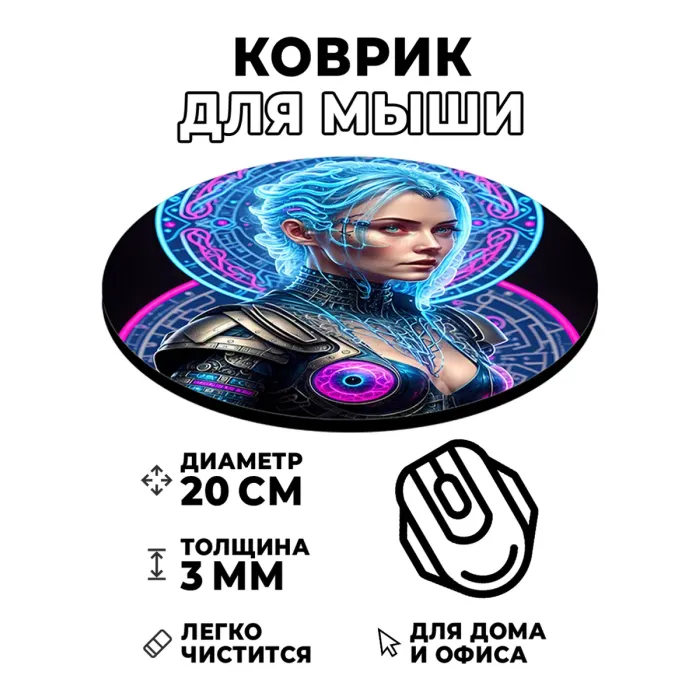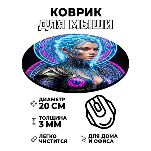 Коврик для компьютерной мыши с уникальным изображением в стиле киберпанк. Этот стильный аксессуар не только украсит рабочее место, но и создаст атмосферу футуристического мира. Диаметр коврика составляет 20 см, а толщина — 3 мм, что обеспечивает комфортное использование и хорошее скольжение мышки.