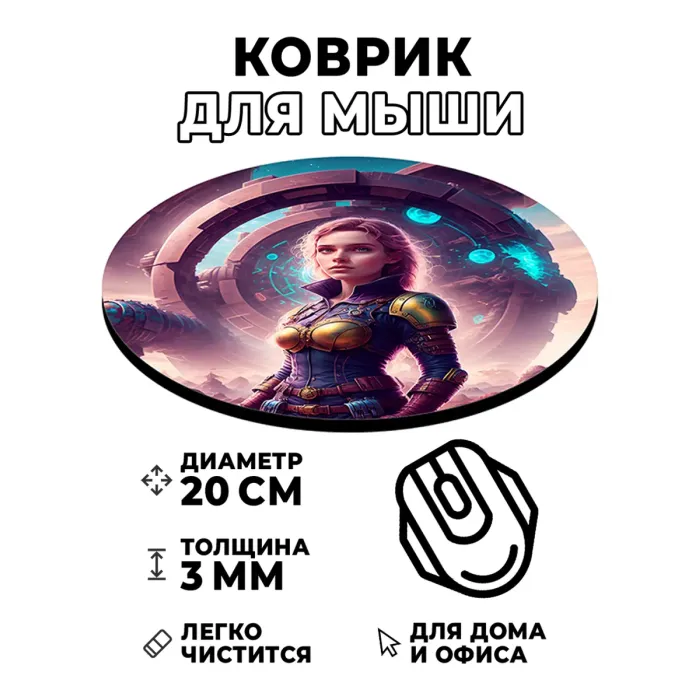Коврик для компьютерной мыши с ярким изображением в стиле киберпанк. Он не только украсит рабочее место, но и добавит атмосферу футуризма и творчества. Диаметр коврика составляет 20 см, а толщина — 3 мм, что обеспечивает комфортное использование.