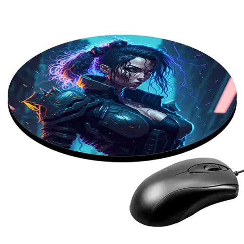 Коврик для компьютерной мыши с уникальным изображением в стиле киберпанк. Этот аксессуар не только добавляет яркие акценты в рабочее пространство, но и обеспечивает комфорт во время работы или игр.