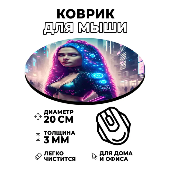 Коврик для компьютерной мыши с уникальным изображением в стиле киберпанк, который станет отличным дополнением рабочего пространства. Он не только привлекает внимание своим ярким дизайном, но и обеспечивает комфортное использование благодаря хорошему скольжению мышки.