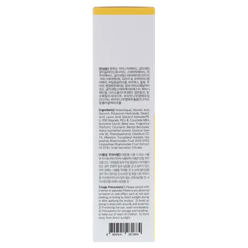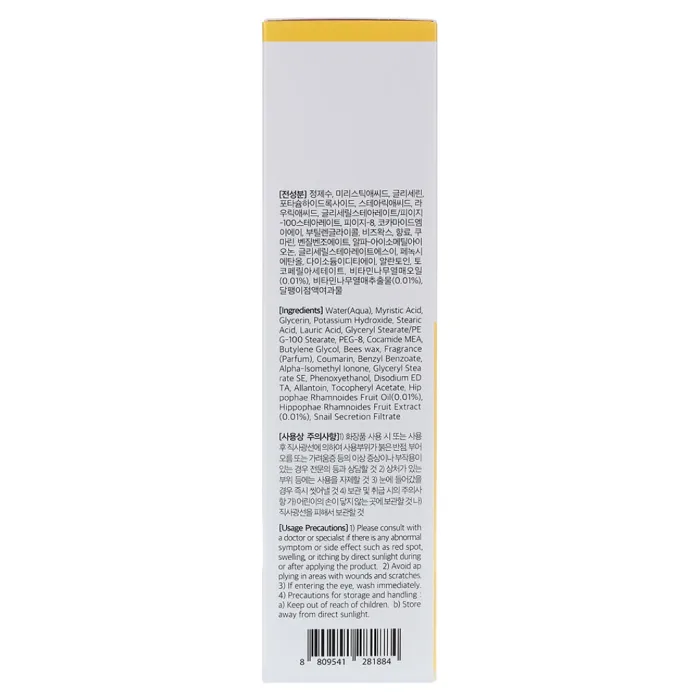 Состав: Purified water, Myristic Acid, Glycerin, Potassium Hydroxide, Stearic Acid, Laurie Acid, Glycetyl Stearate/PEG-100 Stearate, PEG-8, Cocamide MEA, Butylene Glycol, Beeswax, Allantoin,Tocopheryl Acetate (Vitamin E), Hippophae Rhamnoides Fruit Oil and Extract (облепиховое масло и экстракт), Snail Secretion Filtrate.