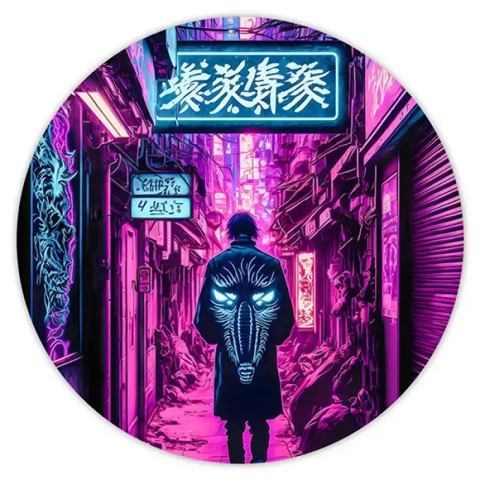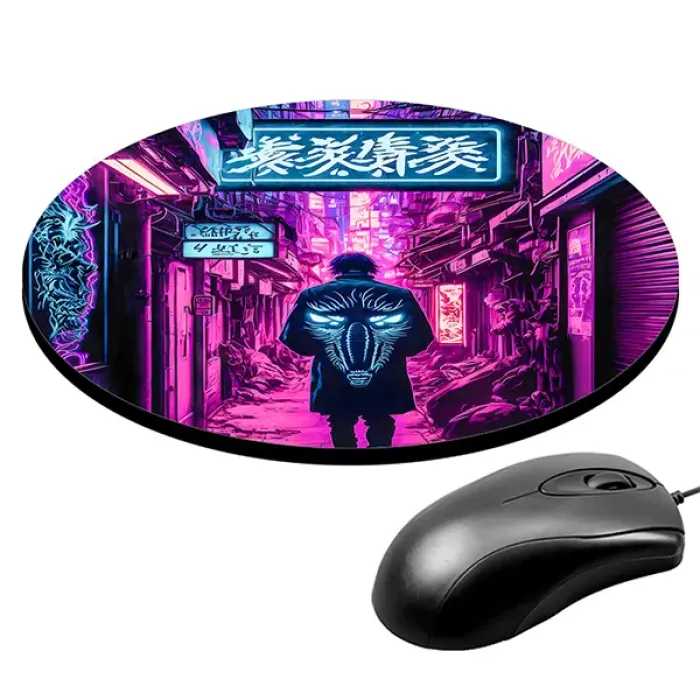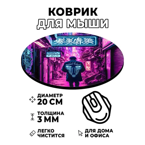 Коврик для компьютерной мыши с ярким изображением в стиле киберпанк, который добавит оригинальности любому рабочему месту. Этот коврик имеет диаметр 20 см и толщину 3 мм, что обеспечивает комфортное использование и отличное скольжение мышки.