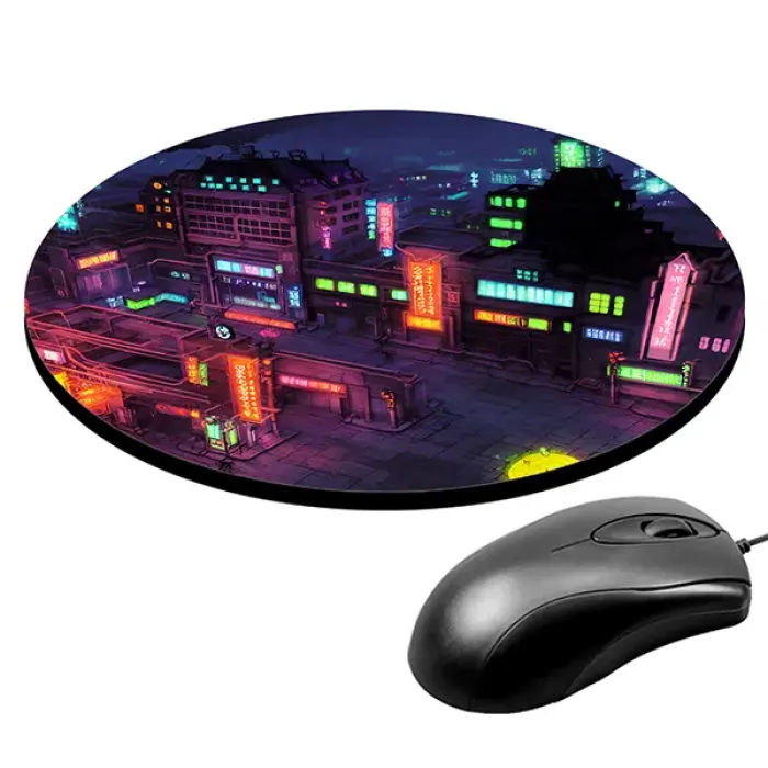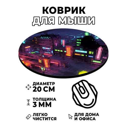 Коврик для компьютерной мыши с ярким изображением в стиле киберпанк, который станет отличным акцентом на рабочем месте. Этот коврик имеет диаметр 20 см и толщину 3 мм, что обеспечивает комфортное использование и хорошее скольжение мышки.