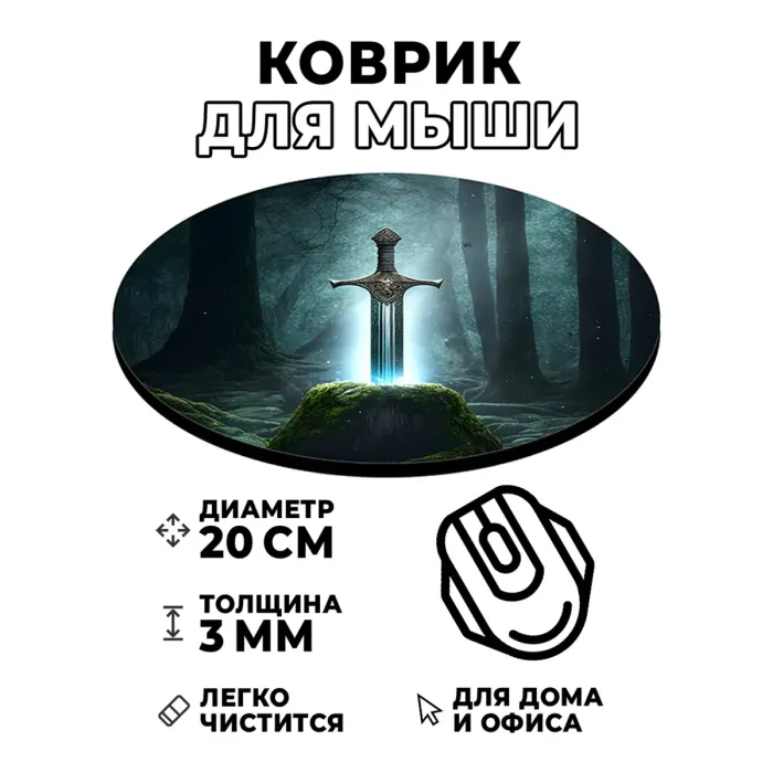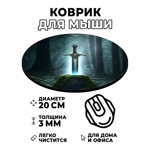 Коврик для мыши Экскалибур — это идеальный аксессуар для компьютерной работы и игр. С диаметром 20 см и толщиной 3 мм, он обеспечивает комфортное использование и отличное скольжение мышки.
