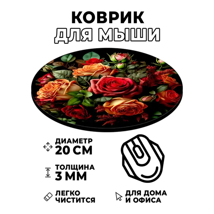 Коврик для компьютерной мыши с изображением букета — это не только функциональный аксессуар, но и стильный элемент рабочего пространства. Он выполнен из качественных материалов, обеспечивающих долговечность и стойкость изображения.