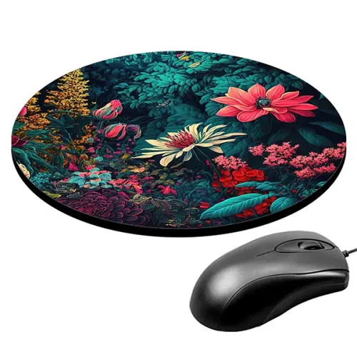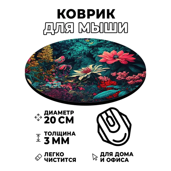Коврик для компьютерной мыши с ярким изображением цветов станет не только практичным аксессуаром, но и стильным элементом рабочего пространства. Он имеет диаметр 20 см и толщину 3 мм, что обеспечивает комфортное использование.