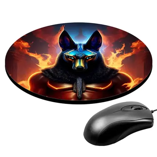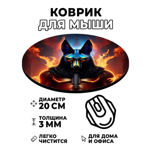 Коврик для компьютерной мыши с изображением Анубиса — идеальный аксессуар для любителей египетской мифологии и стильного дизайна. Этот коврик диаметром 20 см и толщиной 3 мм обеспечит комфортное использование и отличное скольжение мышки.