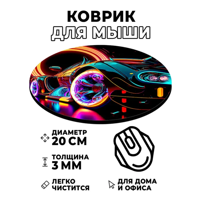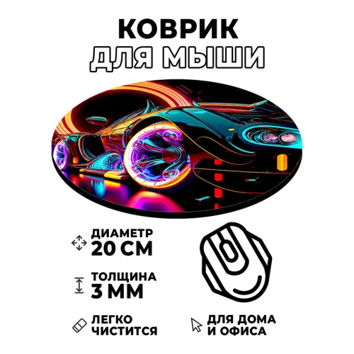Коврик для компьютерной мыши с изображением спортивного автомобиля станет отличным дополнением рабочего стола. Он не только украшает пространство, но и создает комфортные условия для работы. Диаметр коврика составляет 20 см, а толщина — 3 мм, что обеспечивает оптимальное скольжение мышки.