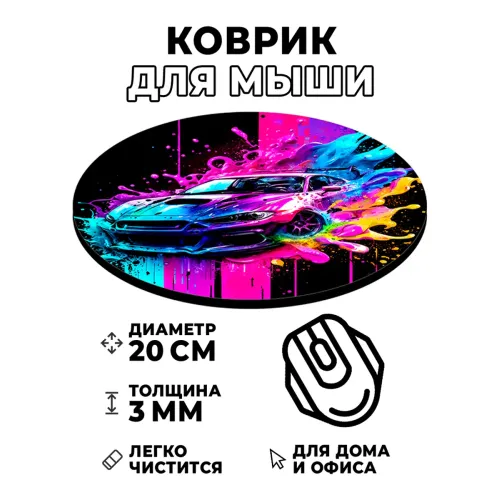 Коврик для компьютерной мыши с изображением спортивного автомобиля станет стильным дополнением рабочего места. Этот коврик диаметром 20 см и толщиной 3 мм обеспечивает отличное скольжение мышки, что делает работу за компьютером более комфортной.