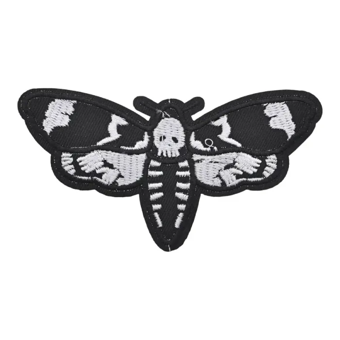 Нашивка для декора одежды и аксессуаров на тканевой основе с машинной вышивкой в виде скелета-бабочки.