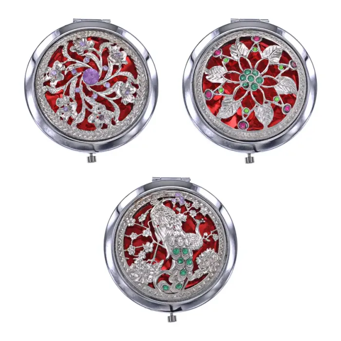 Двойное зеркало с обычным и увеличительным стеклом, диаметром 7 см, в металлическом корпусе с покрытием под серебро и стразами.