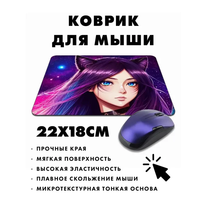 Коврик для мыши с изображением аниме девушки неко станет отличным дополнением к рабочему месту и подарком для поклонников японской культуры. Прорезиненная основа обеспечивает надежное сцепление с поверхностью, а размер 22х18 см и толщина 3 мм делают его удобным в использовании.
