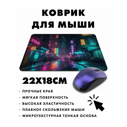 Коврик для мыши с ярким изображением в стиле киберпанк, который добавит уникальности любому рабочему месту. Прорезиненная основа обеспечивает надежное сцепление с поверхностью стола, а размер 22х18 см и толщина 3 мм делают его удобным в использовании.