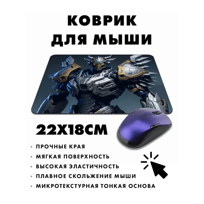 Коврик для мыши в стиле киберпанк с изображением боевого робота станет отличным дополнением рабочего пространства. Он не только привлекает внимание своим ярким дизайном, но и обеспечивает комфорт при использовании. Прорезиненная основа предотвращает скольжение, а размер 22х18 см идеально подходит для любого стола.