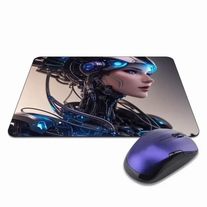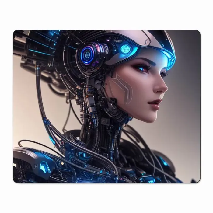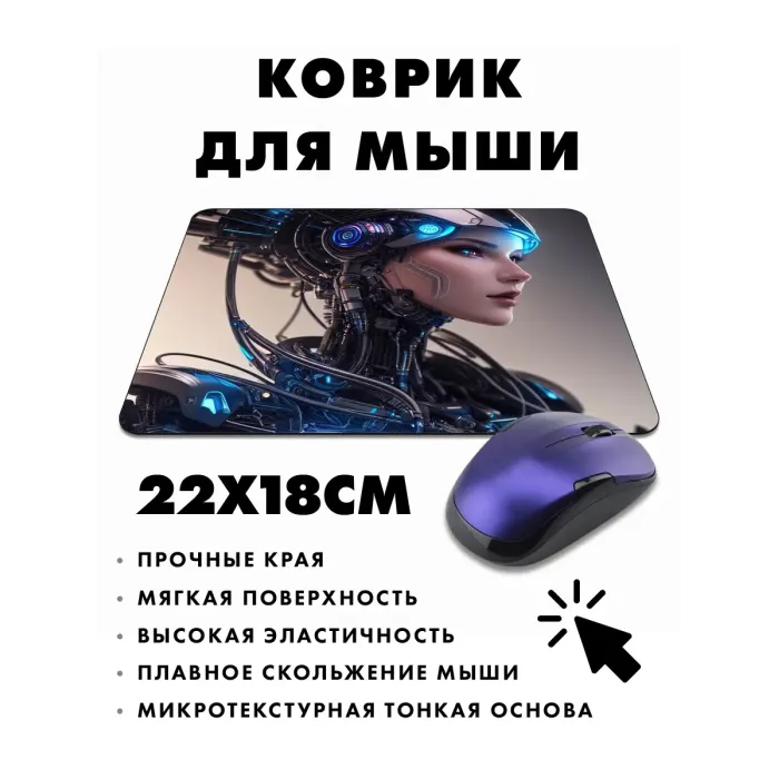 Коврик для мыши — это не только практичный аксессуар, но и стильный элемент рабочего пространства. С изображением киберпанковской девушки-киборга, он привносит атмосферу футуризма и оригинальности в повседневное использование.