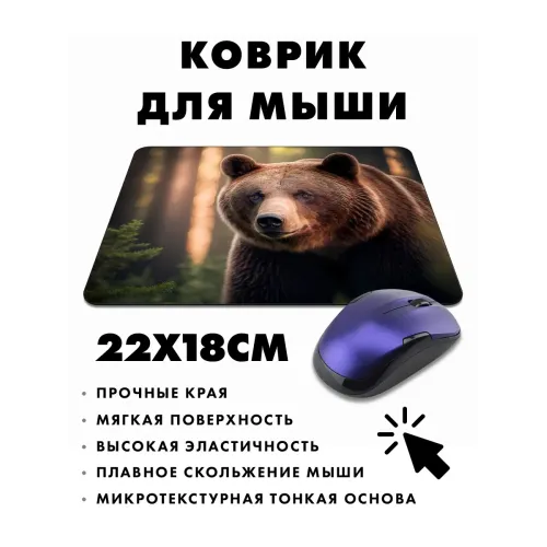 Коврик для мыши с изображением медведя — это не только функциональный аксессуар, но и стильный элемент рабочего пространства. Прорезиненная основа обеспечивает надежное сцепление с поверхностью стола, а размер 22х18 см и толщина 3 мм делают его удобным в использовании.