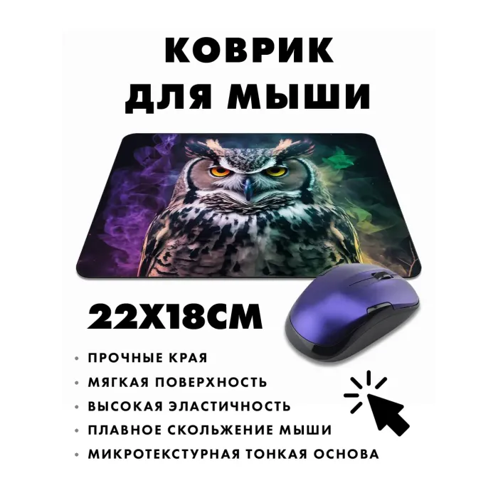 Коврик для мыши с изображением совы — это не только функциональный аксессуар, но и стильный элемент рабочего пространства. Прорезиненная основа обеспечивает надежное сцепление с поверхностью, а размер 22х18 см и толщина 3 мм создают комфортные условия для работы. Изображение отличается стойкостью, четкостью и контрастностью, что добавляет эстетическую привлекательность. Коврик обеспечивает отличное скольжение мышки, позволяя легко управлять курсором во время работы или игры. Такой коврик станет прекрасным дополнением как офисного стола, так и домашнего компьютера.